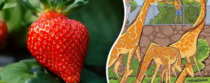 Na sliki živalskega vrta se med žirafami, ljudmi in papigo skriva majhna jagoda. Ključ do nje je v tem, da ne iščeš sadja, temveč oblike, ki jo znan...