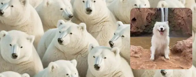 V središču te vizualne uganke se skriva majhen samojed med množico polarnih medvedov. Ključ do rešitve ni v barvi, temveč v obrisih in poziciji glave – eden od.