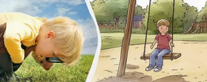 Na tej slidi se deček veselo gugla, vendar nekaj v njegovi okolici ni logično. Ključ do rešitve je v tem, da natančno preveriš vse elemente prizora in poiščeš.