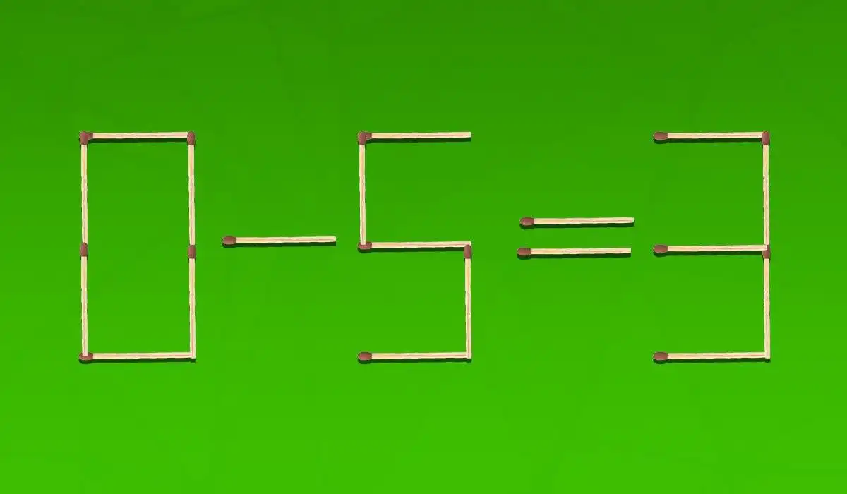 Napačna enakost 0-5=3 je sestavljena iz vžigalic. Če želite, da postane matematično pravilna, lahko premaknete samo dve vžigalici. Ključ je v tem, da ne spreminjate številk na običajen način, temveč razmišljate o tem, kako lahko eno vžigalico spremeni pomen celega števila.