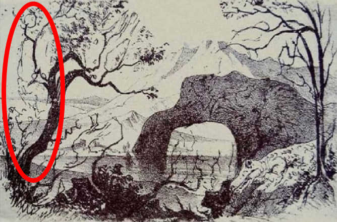 Skriti moški ni narisan na vrhu slike, ampak je sestavni del njenega ozadja. Nahaja se na **levi strani** kompozicije. Če pogledate skupino dreves na levi, boste opazili, da prostor in sence med debla in veje tvorijo popolno človeško silhueto v profilu. Videti je, kot da stoji, naslonjen na drevo. Še več, v obrisu lahko prepoznamo podrobnost, kot je pipa, ki jo drži – kar dodaja še en sloj genialnosti tej iluziji. Njegova glava, ramena in hrbet so oblikovani iz temnih madežev in praznin v gozdni sceni.