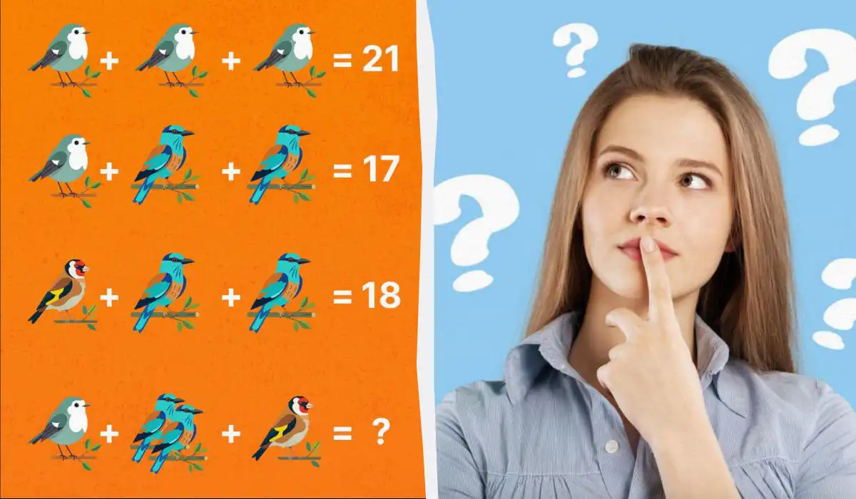Ta matematična uganka s pticami preizkuša vašo sposobnost hitre dedukcije. Ključ je v tem, da vsako slikovno spremenljivko (ptico) zamenjate s številsko vrednostjo in rešite preprost sistem enačb. Pazite, da ne naredite pogoste napake pri seštevanju na koncu!
