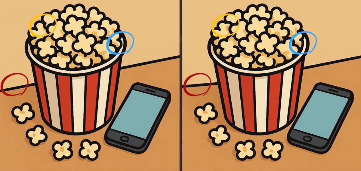 Pred vami sta dve na videz identični sliki vedra s popcornom, a se med njima skrivajo trije majhni, a ključni detajli. Če želite rešiti uganko, se ne osredotočajte na celoto, ampak sistematično preglejte vsak del slike posebej.