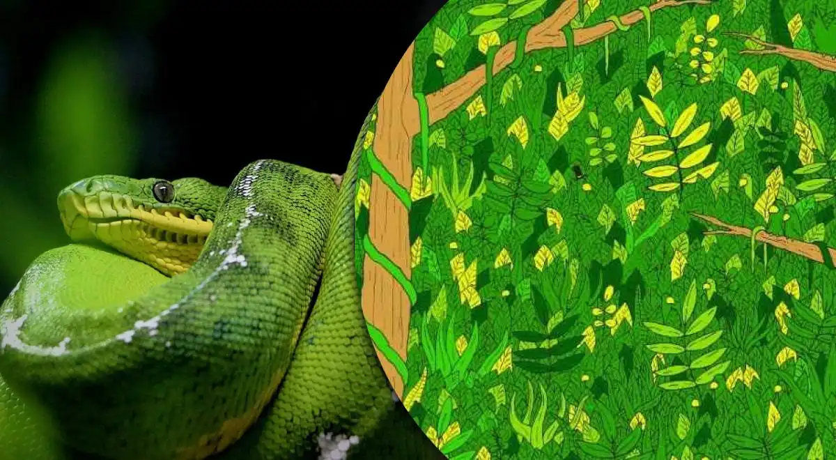 V gosti džungli listja se skriva kača, ki jo najde le najbolj pozorno oko. Ključ do rešitve ni v iskanju celotne oblike, temveč v prepoznavanju nenavadnega vzorca ali barve med monotonijo zelenih listov.