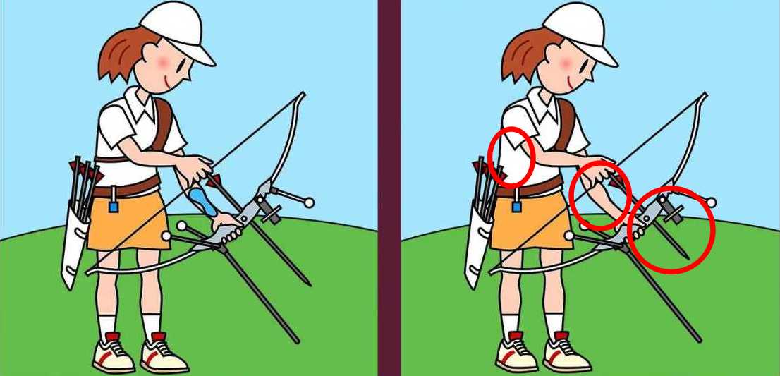 Rešitev je preprosta, ko jo enkrat vidite. Prva razlika je na rokavu lokostrelke: na levi sliki ima rokav dodatno črto oz. gubo, ki na desni manjka. Druga razlika je v krošnji drevesa v zgornjem levem kotu: na eni sliki je en list več ali v nekoliko drugačni poziciji. Tretja, in za mnoge najtežja, je na loku: na eni od slik je konica loka (na vrhu) nekoliko drugačno oblikovana ali krajša. Ključ je bil v tem, da niste strmeli samo v njen obraz, temveč ste skenirali celotno sliko po sektorjih.