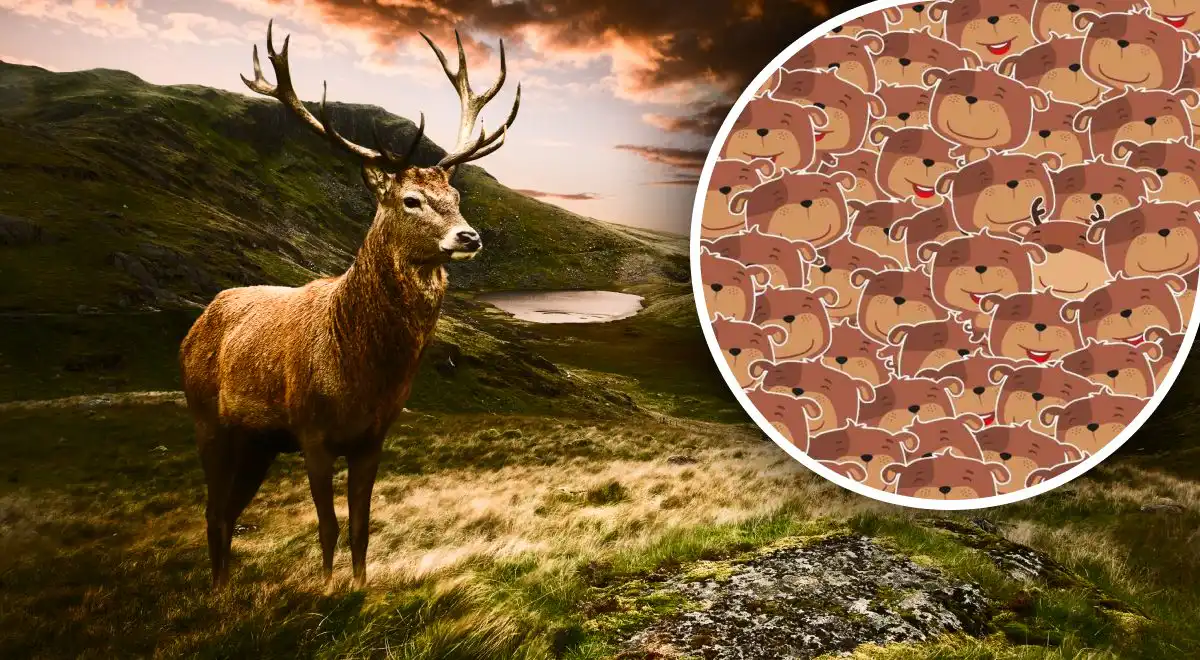 Na tej sliki se med družbo medvedov skriva en sam jelen. Ključ do njegovega odkritja ni v barvi, temveč v prepoznavanju edinstvene oblike, ki jo iščemo – rogovja. Poglejte, kje se vzorec prekine.
