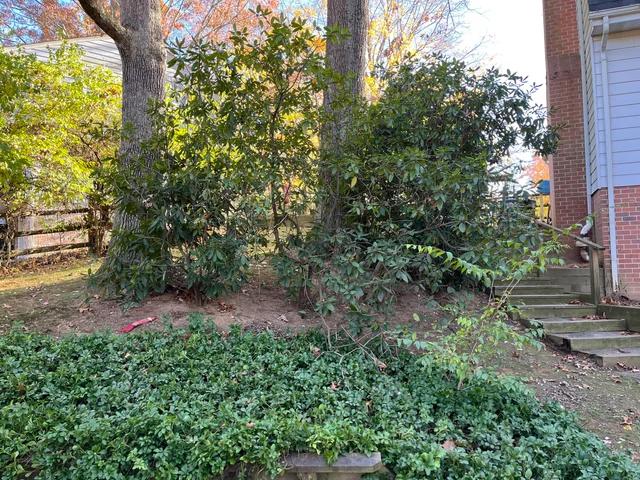 Čas je potekel! Če še vedno ne vidite psa, je tukaj. Pes se ne skriva globoko v grmovju. Nahaja se ob vznožju velikega drevesa na **levi strani** slike. Ne vidite njegovega telesa, saj je verjetno skrito za deblom ali listjem. Vidite le del njegove glave.