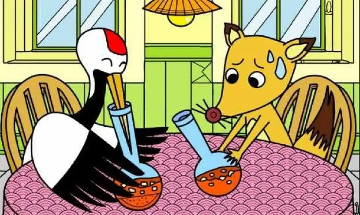 Poglejte si to sceno. Žerjav z dolgim kljunom mirno zajema juho iz visoke bučke, medtem ko lisica nejevoljno opazuje. Ilustracija je polna tekstur in vzorcev – od perja in dlake do lesa in listja. In nekje med temi številnimi detajli se skriva navaden dežnik. Ni postavljen na očitno mesto, njegova oblika pa je spretno prikrita z elementi slike. To ni preizkus hitrosti, temveč preizkus perceptivne spretnosti. Ali lahko prebijete vizualni hrup in najdete tisto, kar ne spada v pravljico?