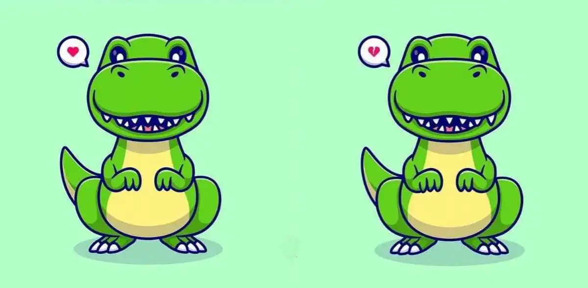 Poglejte si zgornji par slik. Na obeh je isti prijazen, zelen dinozaver. A ustvarjalec te uganke je v eno od slik prikril tri napake. Vaša naloga je, da jih odkrijete. Ne gre za velike, očitne spremembe, ampak za majhne podrobnosti, ki jih lahko zgrešite, če le bežno pogledate. Takšne naloge odlično trenirajo pozornost do podrobnosti in vizualno preglednost.