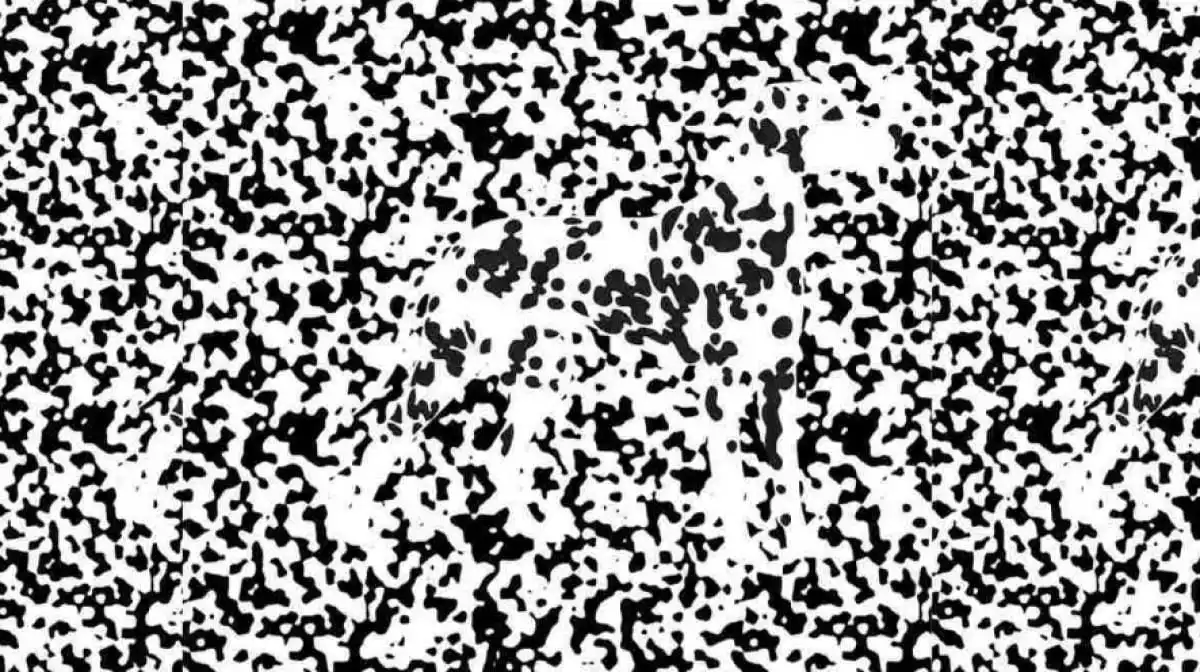 Na kaotični sliki črnih in belih pik se skriva jasna silhueta psa. Ključ do rešitve ni v iskanju podrobnosti, temveč v tem, da se umaknete in pogledate na celotno sliko z drugačne perspektive – takrat se bo vzorec nenadoma izoblikoval.