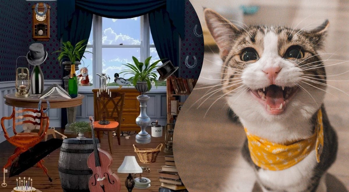 Na zmedeni sliki, polni predmetov, se skrivata dve mački. Ključ do uspeha je v tem, da ne iščete le celih oblik, temveč tudi posamezne detajle, kot so ušesa, rep ali oči, ki se lahko skrivajo med drugimi predmeti.