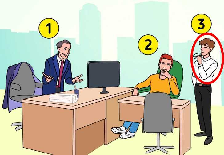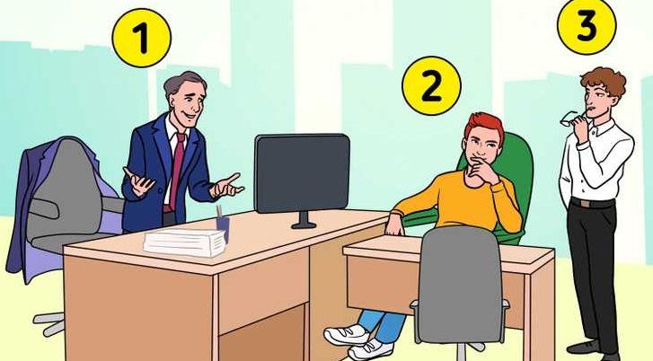 Predstavljajte si, da ste novi sodelavec in prvič vstopite v to pisarno. Vidite tri moške: enega za mizo in dva, ki stojita pred njim. Vsi so lepo oblečeni in se resno pogovarjajo. Vaša naloga je v samo petih sekundah ugotoviti, kdo je glavni. Ne gre za ugibanje po videzu, temveč za logično razmišljanje in pozornost do detajlov. Kaj na sliki lahko razkrije hierarhijo?