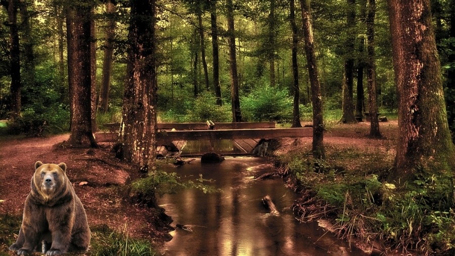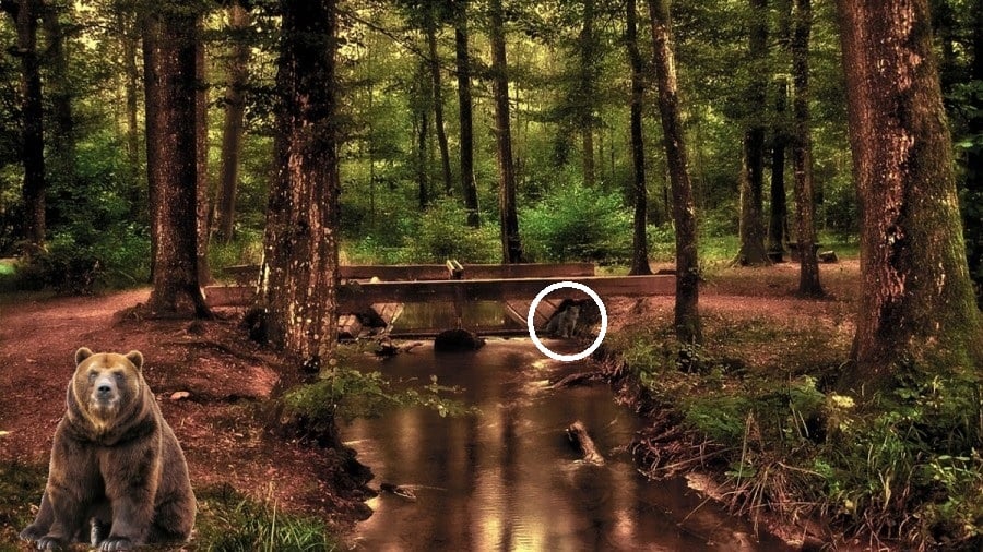 V gostem gozdu se je skril majhen medvedek. Vaša naloga je, da ga najdete v samo 15 sekundah. Ključ do uspeha je v tem, da ne iščete le medvedje oblike, temveč tudi kontrast barv in pregled celotne slike, še posebej okoli lesene konstrukcije na reki.