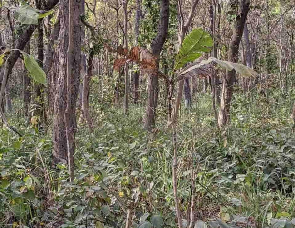 V gozdni gostiščini se skriva velika mačka, čigar proge se popolnoma zlijejo z vzorci svetlobe in sence na drevesnih deblih. Ključ je, da ne iščete cele živali, temveč njen pogled.