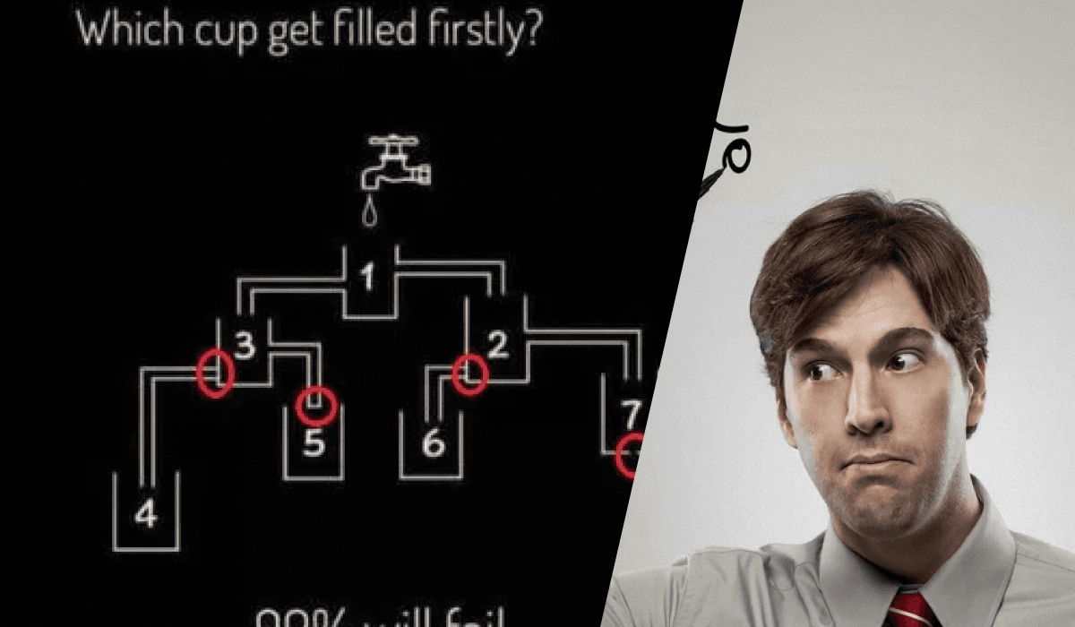 Ta uganka preizkuša tvoje razumevanje toka tekočine in pozornost do detajlov. Na diagramu se voda izliva v sistem povezanih posod, vendar ne vse povezave delujejo. Ključ je v tem, da nekatere cevi niso odprte, nekateri kozarci pa imajo luknje. Kateri kozarec se napolni prvi? Ne hiti s sklepanjem samo na podlagi višine.