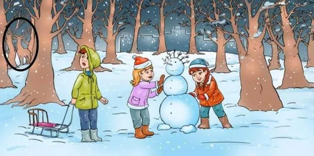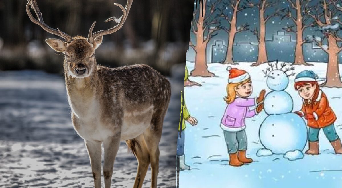 Poglejte to praznično sliko. Otroci se veselo igrajo v zasneženem gozdu: dva izdelujeta snežaka, tretji pa drži sani. Drevesa in vzorec sneženih vej ustvarjajo gosto vizualno teksturo, ki lahko preprosto odvrne pozornost. Toda nekje v tem zimskem prizorišču se skriva severni jelen – majhen in spretno prikrit. Naloga je, da ga najdete v samo 8 sekundah. Če vam to uspe, to kaže na izjemno hitrost zaznavanja in prostorsko orientacijo.