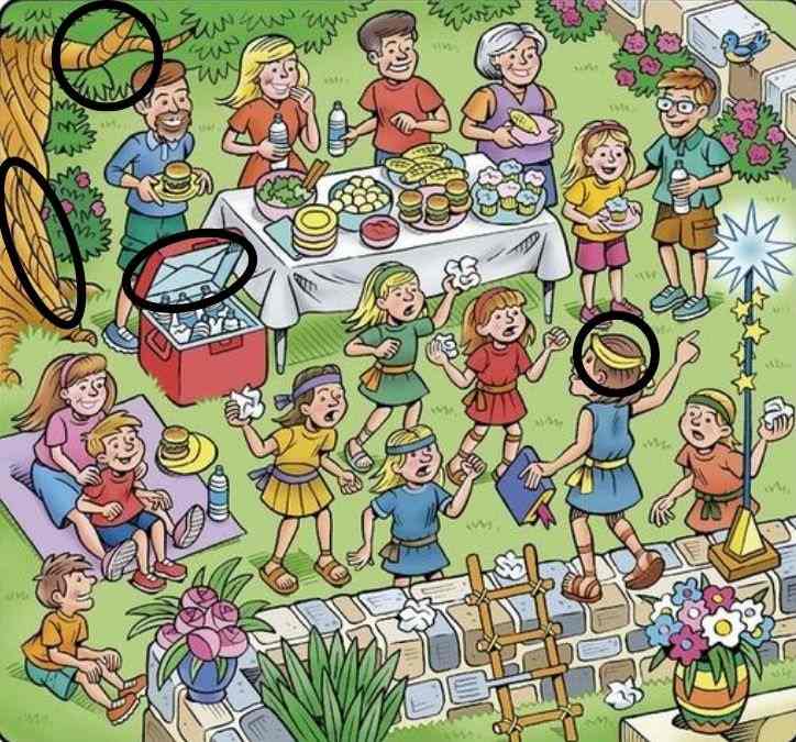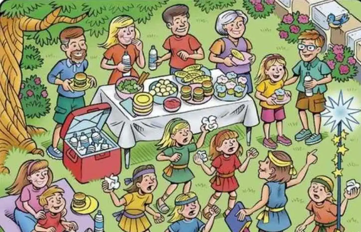 Na sliki, ki prikazuje živahno družinsko srečanje na prostem, so se skriti štjeje vsakdanji predmeti: kuverta, korenček, banana in pero. Ključ do njihovega odkritja ni v tem, da jih iskreno iščemo, temveč v tem, da spremenimo način gledanja in poiščemo oblike, ne predmete same.