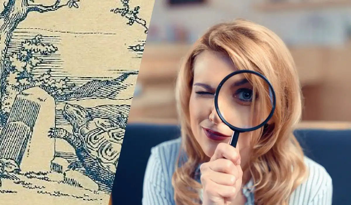 Slika je polna podrobnosti: starinski slog, drevesa, grmovje in želva na jasi. Vaša oči bodo morda nemudoma začele preiskovati travo in grmovje, iskati ušesa ali rep. Toda prava varka te iluzije ni v majhnosti, temveč v tem, kako se oblika zajca združi z nečim drugim na sliki. To ni iskanje majhnega predmeta, temveč prepoznavanje patterna v navidezno običajnem elementu.