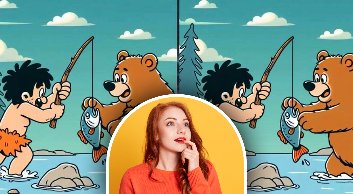 Na sliki mož in medved skupaj lovita ribe, vendar se trije majhni detajli ne ujemajo. Ključ do rešitve je v tem, da ne gledaš na celoto, ampak sistematično preverjaš vsak del slike.