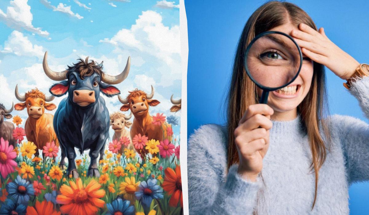 Na barviti sliki s cvetličnim poljem in kravami se skriva premeten metulj. Naloga je, da ga najdete v samo 7 sekundah! Ključ do uspeha je v tem, da ne iščete le med cvetjem, temveč tudi na samih živalih.