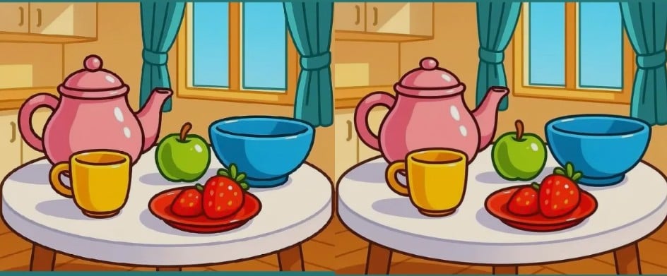 Rešitev: Razlike niso v barvah, ampak v majhnih geometrijskih podrobnostih. Prva razlika je v jagodi na vrhu slike, levo od sredine. Na eni sliki ima jagoda listek, na drugi ga nima. Druga razlika je v skodelici na desni strani mize. Opazite lahko, da se vzorec na ročaju skodelice razlikuje – na eni je črta pod vrhom ročaja prekinjena. Tretja in najbolj zvita razlika je v listu, ki leži na mizi pod jagodami. Na eni sliki ima list konico usmerjeno v eno smer, na drugi sliki pa je ta konica obrnjena drugače ali manjka. To so tisti trije zvitokrati, ki preizkusijo vašo natančnost.