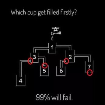 Predstavljajte si, da odprete pipo in opazujete tok vode. Vaša naloga je ugotoviti, katera od sedmih oštevilčenih skodelic se bo prva popolnoma napolnila. Ne gre le za to, katera je najnižja, ampak katera je prva, ki bo zadržala vodo do roba. Vse povezave med posodami niso enake – nekatere cevi so zamašene, druge vodijo v prazno. Čas za razmislek je omejen, zato se pripravite na hitro analizo.