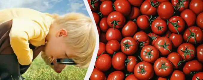 Na tej sliki, polni rdečih paradižnikov, se skriva eno granatno jabolko. Njegova barva je zelo podobna, zato ga je težko najti. Ključ do uspeha je v tem, da.